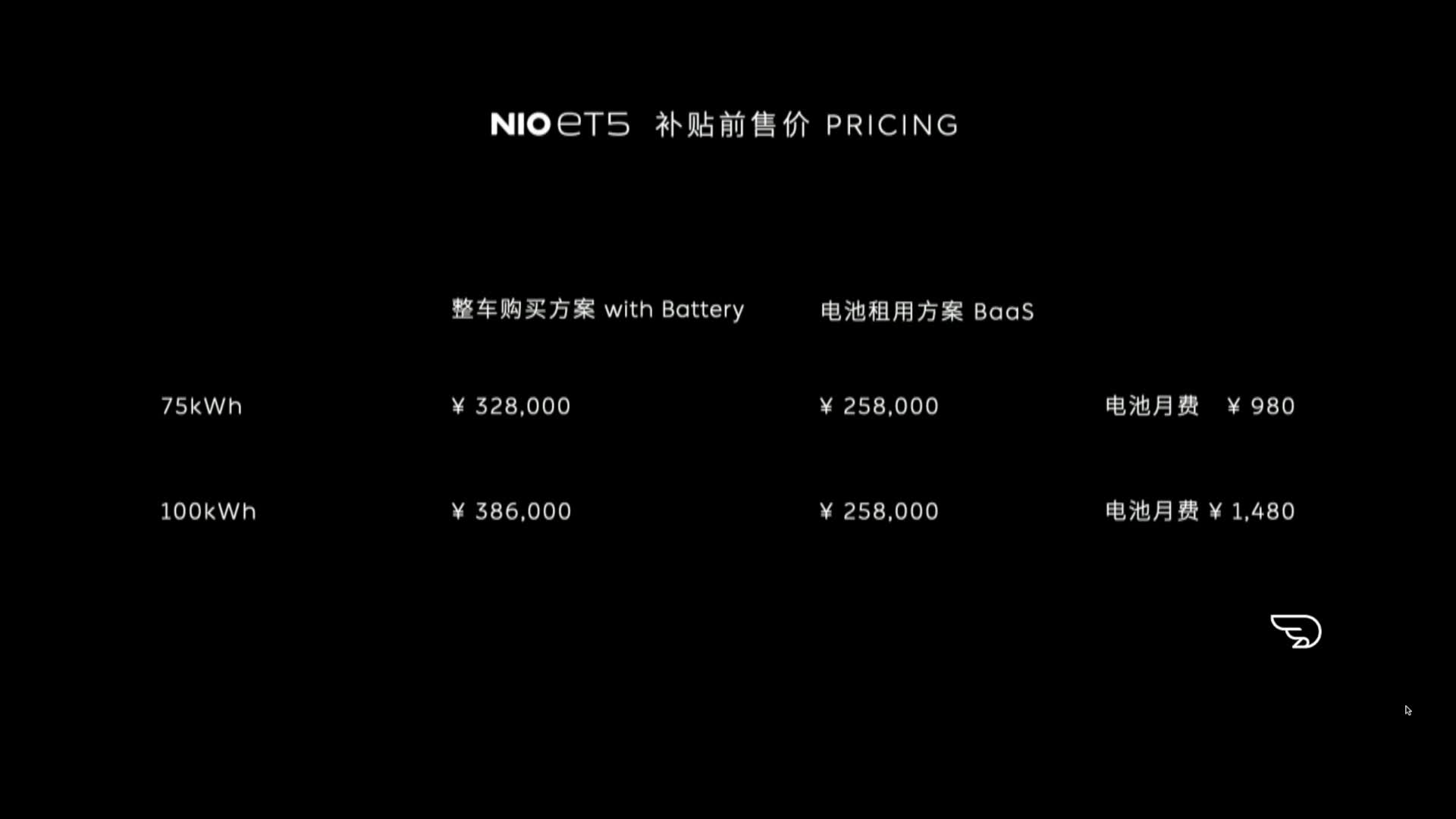 # 蔚来ET5整车75kWh补贴前售价 32.8 万元。100kWh价格38.6万元