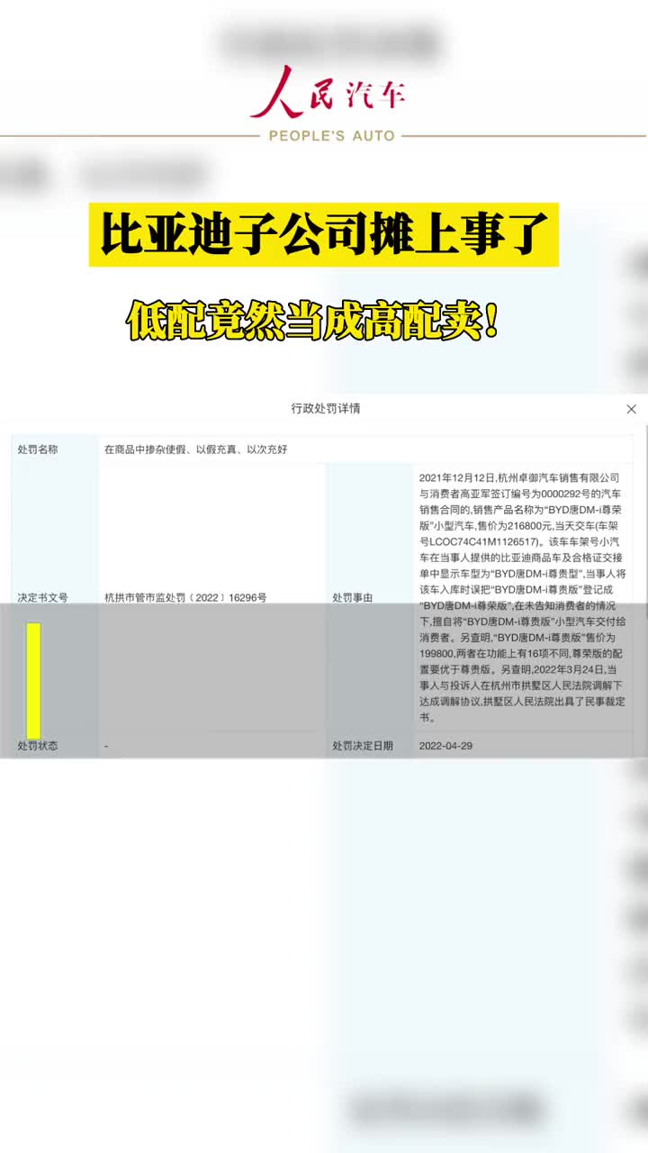 比亚迪子公司摊上事了,低配当成高配卖,被罚1万元